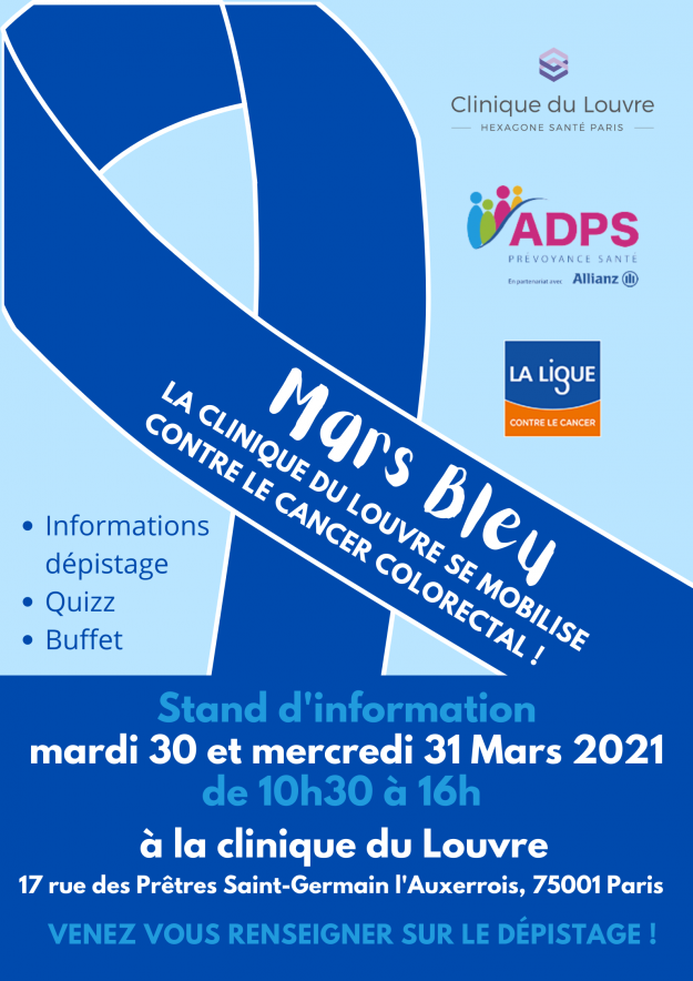 La clinique du Louvre organise son stand d’information Mars Bleu et la prévention du cancer colorectal Mardi 30 et Mercredi 31 Mars 2021 de 10h30 à 16h. N’hésitez pas à venir vous renseigner sur le dépistage !